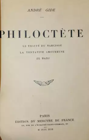 Matarasso XIII. Erste Ausgabe. - Zur Meisterbuchbinderin vgl. Flety, Dict. des relieurs francais, S. 121. Eines von 300 Ex. - ╔Mit eh. Verf.-Widm. u. Unterschr.╗ auf Vortitel: "a Madame Rachilde au cordial hommage, Andre Gide". - Exlibris.
