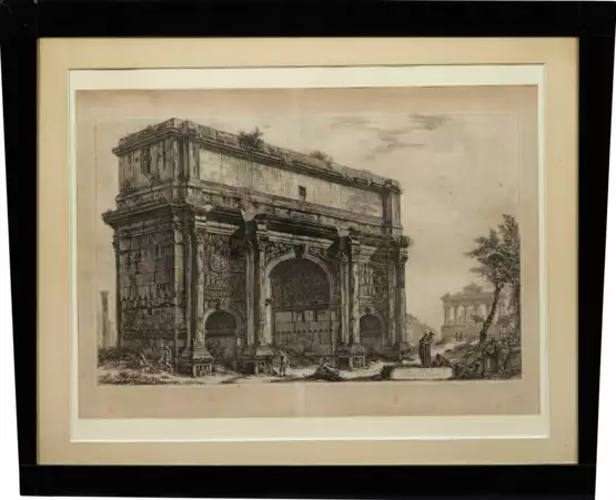 Radierung/Bütten. In der Platte bez. "Cavalier Piranesi F." sowie mit Titel. Ansicht des Bogens des Septimius Severus, im Hintergrund der Tempel des Saturn. Aus der Folge "Vedute di Roma", erstmals erschienen 1747-1778. Focillon 754; Hind 99. Plattenmaß 47,5 cm x 71,5 cm. Rahmen.