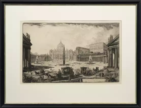 Radierungen/Velin. Spätere Abzüge aus dem Radierzyklus "Vedute die Roma" für die Pariser Ausgabe, erschienen bei Firmin Didot, um 1835. Die Erstausgabe erfolgte in Einzelblättern Ende 1747 - 1778, zunächst hrsg. von Giovanni Bouchard, ab 1760 vom eigenen Verlag. Dabei: "Veduta in prospettiva della gran Fontana dell'Acqua Vergine detta di Trevi [...]" (Tafel 34, Wvz. Focillon 734), "Veduta della gran Piazza e Basilica di S. Pietro [...]" (Tafel 4, Focillon 721), "Veduta del Ponte e Castello Sant'Angelo" (Tafel 52, Wvz. Focillon 793), "Veduta dell'Arco di Settimio Severo" (Tafel 20, Wvz. Focillon 754), "Veduta interna della basilica di S. Maria Maggiore" (Tafel 16, Wvz. Focillon 728). Teilweise mit Trockenstempel "Regia Calcografia di Roma" (Lugt 2144). Plattenmaße ca. 37,5-47,5 cm x 58,1-71,2 cm. Rahmen.