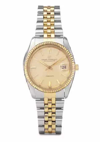 Edelstahl-Gehäuse mit vergoldeter Lünette und Schraubboden. 36 mm. Automatik Kal. Champagner-Zifferblatt mit Strichindizes und Stabzeigern. Zentralsekunde und Datum bei 3 Uhr. Vergoldetes Bicolorband mit Faltschliesse. Funktionstüchtig. MIt Box.