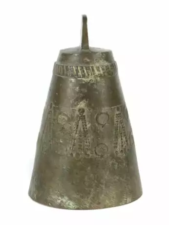 Glocke 19. Jh., Bronze, Wandung umgehend mit reliefiertem Dekor, mit Klöppel, H: ca. 19,5 cm. Altersspuren.