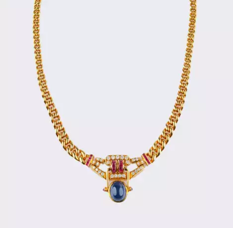 Lot 118 | Goldcollier mit Saphir-Cabochon, Rubinen und Brillanten.
