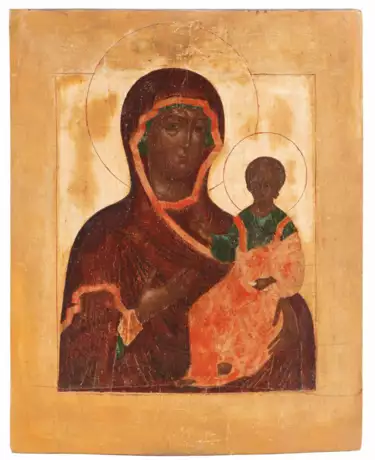 Russisch, 19.Jh., in der Art des 17.Jhs. Tempera über Kreidegrund auf Holz. Im vertieften Bildfeld Darstellung der Gottesmutter, das segnende Kind mit Schriftrolle im Arm haltend. 30x24 cm.