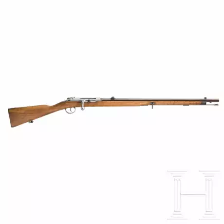 Kal. 11,15x37R, Nr. 9, nummerngleich, fast blanker Lauf, Länge 64 cm. Links auf der Laufwurzel und Hülse kaiserliche Abnahmestempel. Weder auf Hülse noch Lauf Herstellerbezeichnung. Klappvisier mit einer Klappe. Waffe überarbeitet und Lauf neu bräuniert, Hülse und Schloss weiß poliert. Gebogener Kammerstengel. Nussholzschaft mit zwei Riemenbügeln und Putzstock. Sehr seltene Waffe mit niedriger Seriennummer. Länge 114 cm.