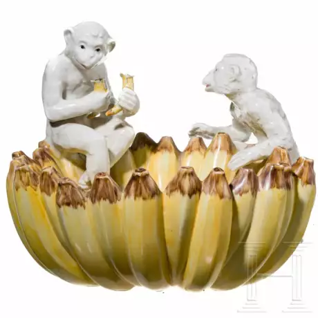 Majolika. Große Schale in Form von aneinandergereihten Bananen. Auf dem Rand sitzt ein Affe mit zwei geöffneten Bananen. Ein weiterer Affe, der an den Bananen hochklettert, möchte diese ergreifen. Mittig gebrochen und geklebt. Kleinere Glasurabplatzer. Durchmesser: 42 cm, Höhe: 34 cm