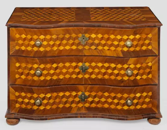 Nussbaum und Ahorn, furniert. Gerader, querrechteckig angelegter Korpus auf profilierter Zarge und gedrückten Füßen. In der gegliederten Front drei breite, doppelt geschweifte Schubladen. Gering überstehende Deckplatte. Flächendeckend breit gerahmte Furnierfelder aus Würfelmarketerie. Erg.; H. 85 cm. 126 cm x 67 cm.