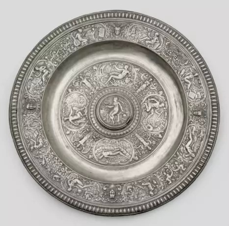 Zinn. Runde Form mit vertieftem, mittig aufgewölbten Spiegel. Zentral die Allegorie der Mäßigung in Göttinnengestalt umgeben von vier Kartuschen mit Allegorien der vier Elemente. Breite Fahne mit alternierenden Darstellungen der Minerva und der sieben Freien Künsten. Nach dem Vorbild der Temperantia-Schale von Francois Briot (tätig 1580-1611) im Württembergischen Landesmuseum Stuttgart. Rep.; D. 46,5 cm.