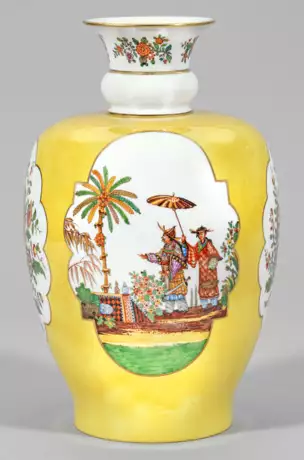 Über dem Rundstand balusterförmig aufgewölbter Korpus mit eingezogener Schulter, schmalem Hals mit Wulstring und trichterförmig ausschwingender Mündung. Schauseitig der Wandung großflächige, goldgerahmte vierpassige Reserven mit Chinoiserieszenen nach Johann Gregorius Hoeroldt. In blühender Gartenlandschaft festlich gekleidete Chinesen mit Schirm und Schwert bzw. Kind mit Fächer und Chinese mit Schriftblatt. Alternierende Kartuschen mit prächtigem Indianischem Blumendekor und Chrysanthemenstaude sowie Blütenzweigen unterhalb der Mündung. Feine polychrome Malerei mit gelbem Fond. Goldstaffage. Modell-Nr. 50412. Jahreszeichen. Schwertermarke. H. 40 cm.