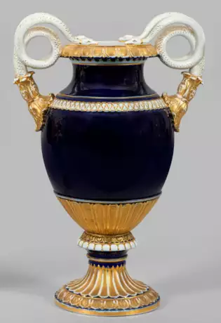 Auf hochgezogenem Rundfuß amphorenförmiger Korpus, umzogen von vergoldeten, reliefierten Ornamentbordüren. Seitlich aus plastischem Akanthusblattansatz aufsteigende Henkel in Gestalt von spiralförmig eingerollten Schlangenpaaren. Flächendeckender kobaltblauer Fond mit Goldstaffage. Entw. Ernst August Leuteritz. Modell-Nr. A 148. Minim. ber.; Schwertermarke. H. 48 cm.