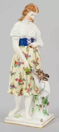Auf rechteckigem Sockel stehendes Mädchen in ländlicher Kleidung aus einem zartgelben Rock mit Indianischem Blumenmuster, weißer Bluse und blauem Mieder. Das lange, hellbraune Haar ist seitlich in lockeren Zöpfen geflochten. Sie senkt ihren Blick zu einem Reh, dem verwunschenen Brüderchen, das sie fürsorglich füttert. Polychrome Malerei. Entw. Johann Christian Hirt, 1881. Nach einer Märchenfigur der Brüder Grimm. Entw.-Bez. "J. Hirt". Modell-Nr. M 163. Unw. rest.; Schwertermarke. H. 49,5 cm.