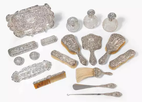 Silber/Glas, 18-teilig. Meistermarke H. Matthews. Bestückt mit Tablett, Schalen, Dosen, Flakons, Handspiegel, Bürsten, Pinsel, Kamm, Schuhlöffel, Schnürsenkel-Zieher. Alle Teile mit reich ausgestaltetem Reliefdekor und gravierten Ligaturinitialen. Garantie-, Meistermarke, Feingehalt 925. L 5,5 – 30,5 cm.