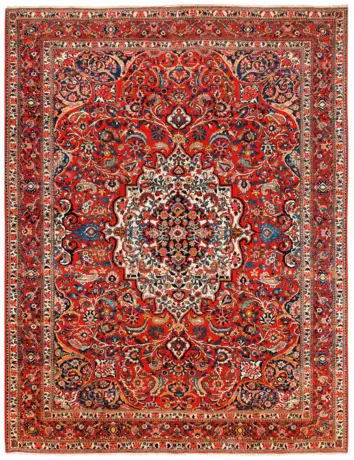 Persien. 1940er Jahre. Wolle auf Baumwolle. In hellroten Innenfeld großes, elfenbeinfarbenes Zentralmedaillon sowie passig geschweifte Ecklösungen. Flächendeckend dichte Musterung aus Rankenwerk. Umlaufend rotgrundige Palmettenbordüre, begrenzt von schmalen Bändern. 420 cm x 320 cm.