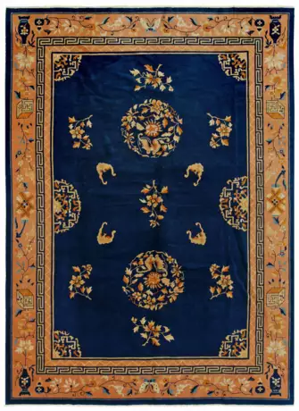 China. Mitte 20. Jh.; Wolle auf Baumwolle. Im tintenblauen, monochromen Innenfeld Medaillons aus Blütenzweigen sowie lose gestreute Musterung aus Blüten und Fledermäusen. Umlaufend breite apricotfarbene Bordüre mit Vasenmotiven, begrenzt von Mäanderband. 252 cm x 348 cm.