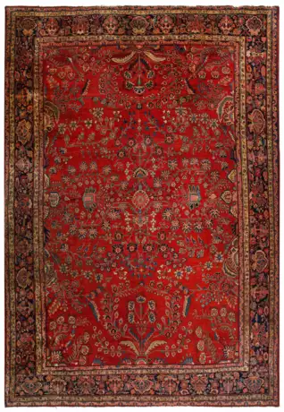 Persien. Um 1920. Wolle auf Baumwolle. Im roten Innenfeld flächendeckende Musterung aus ornamental angeordneten Blütenrispen- und Dolden. Umlaufend breite, dunkelgrundige Palmettenbordüre, begrenzt von schmalen Bändern. Altersspuren. 373 cm x 261 cm.