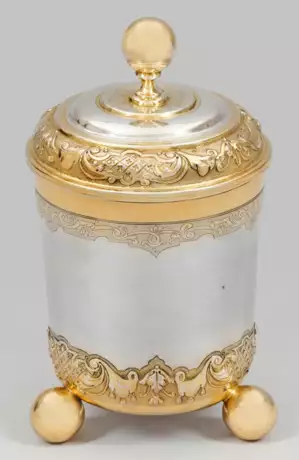 Silber, teilvergoldet. Über ausgestellten Kugelfüßen glatte, leicht konische Wandung, umrahmt von getriebener und gravierter Bandwerkbordüre. Innen vergoldet. Deckel gewölbt, an Rand und Zentrum mit umlaufendem Blatt- und Bandwerkdekor. Kugelknauf. Tremolierstrich, Stadtmarke , Meister Philipp Stenglin (wird Meister 1696). Gew. 475 g. H. 14 - 20,5 cm.