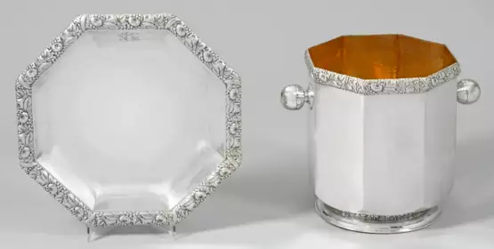 Silber. Achteckige Wandung und Randdekor in Form eines umlaufenden Relieffrieses mit Laub und Früchten. Flaschenkühler mit eingezogenem Rundfuß und zwei seitlichen Handhaben in Kugelform. Schale monogr. "RE". Gest. 800, Beschau- und Herstellerzeichen, Händlermarke "E. Goldschmidt", Modellnr. 11398. Gew. zus. ca. 2845 g. H. 5,5 cm – 26,5 cm. D. 25,5 cm - 36,5 cm.
