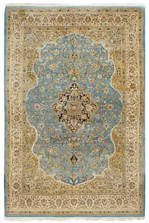 Persien. Mitte 20. Jh.; Wolle auf Baumwolle. Im hellblauen Innenfeld dunkelgrundiges Zentralmedaillon mit Anhängern sowie breite, beigefarbene Ecklösungen. Flächendeckende Blütenmusterung. Umlaufend helle Palmettenbordüre. 246 cm x 378 cm.