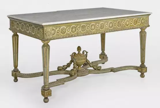 Holz, reliefplastisch geschnitzt und in unterschiedlichen Grau- und Cremetönen gefasst. Gerade Zarge aus erhaben reliefiertem Wellenbandfries und verkröpften Ecken mit Blütenrosetten auf kannelierten Balusterbeinen, unterhalb durch geschwungene Stege mit Schuppendekor verbunden. In der Mitte großes Vasenmotiv mit Lorbeerfestons. Gering überstehende Deckplatte aus weißem Marmor. H. 79,5 cm. 155 cm x 91 cm.