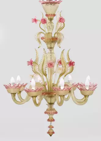 8-flg.; Grüngelbes und roséfarbenes Muranoglas. Mehrfach gegliederter Balusterschaft. Unterhalb davon ausgehend stark geschwungene, in sich gedrehte Leuchterarme mit tief gemuldeten, schalenförmigen Traufschalen als Träger für Leuchtmittel. Reicher Dekor aus gestreckten Blattmotiven und Blüten. Korrespondierender oberer Abschluss. H. 103 cm. D. 86 cm.