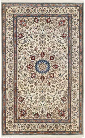 Persien. Wolle mit Seidenhighlights auf Baumwolle. Im elfenbeinfarbenen Innenfeld rundes Zentralmedaillon sowie Ecklösungen aus Arabesken. Flächendeckende Musterung aus Blütenranken sowie umlaufend breite korrespondierende Bordüre. 353 cm x 214 cm.