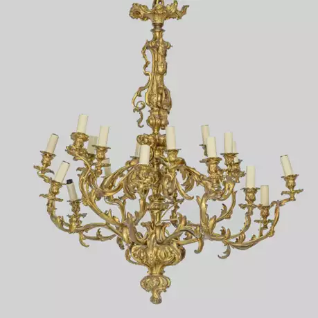18-flg.; Bronze, vergoldet. Mehrfach gegliederter Balusterschaft, flankiert von Volutenspangen. Davon ausgehend stark geschwungene Leuchterarme aus üppigem Blattwerk als Träger für gestuft angeordnete Leuchtmittel mit vasenförmigen Tüllen. Nachträglich elektrifiziert. H. 100 cm. D. 92 cm.