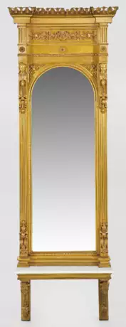 Holz, stuckiert, gefasst und vergoldet. Über schmaler Wandkonsole aus profilierter Zarge und eingerollten Volutenmotiven mit Marmorplatte, hochrechteckige, teilw. kannelierte Spiegelrahmung mit segmentförmigem oberen Abschluss, flankiert von plastisch gestalteten Genien. Oberhalb breites Gesims mit durchbrochen gearbeiteter Palmettenbekrönung. Ges.-H. 295 cm. 101 cm x 31,5 cm.