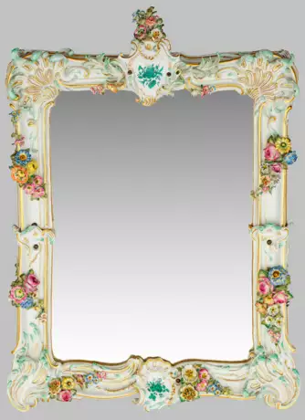 In barocker Formensprache von Johann Joachim Kaendler, dem bedeutendsten Meissener Modelleur des 18. Jhs., erfreuten sich derartige Prunkspiegel weiterhin großer Beliebtheit am Hofe und in repräsentativen Räumlichkeiten.