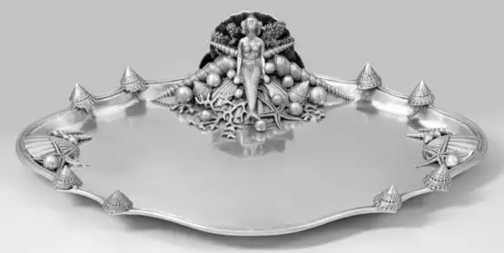 Zinn, plated. Auf 6 plastisch ausgeformten Muschel-Füßen Platte mit geschweiftem Rand und glattem Spiegel. Randbereich belegt mit plastisch ausgearbeiteten maritimen Details wie Seesternen, Muscheln, Schnecken und Korallen sowie einer sitzenden Meerjungfrau auf mehreren Muscheln. Gem. "Figura Piero per Atena", "Etain 95%". H. 11,5 cm. 54,5 cm x 39 cm.