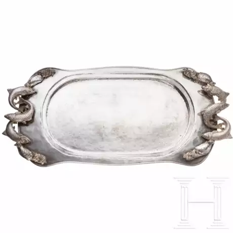 Versilbert. Großes ovales Tablett mit breiter Fahne und profiliertem Rand. Auf den Enden jeweils drei applizierte Fische und Muscheln. Sehr aufwendig punziert und graviert. Rückseite bezeichnet "Franco Lapini Made in Italy". Länge: 74,5 cm