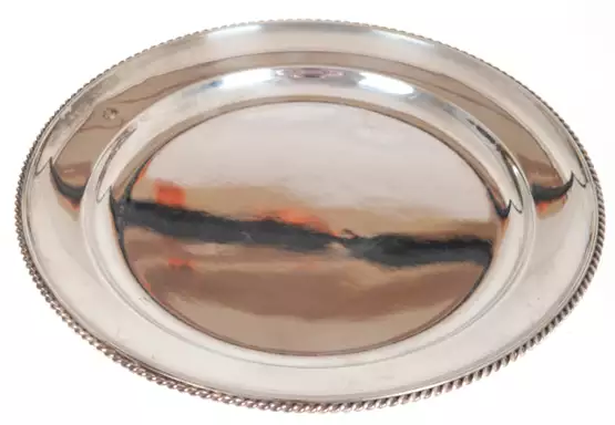 Lot 746 | Großes Tablett, rund, versilbert, mit Kordelrand, 2 Dellen, Dm. 32,5 cm