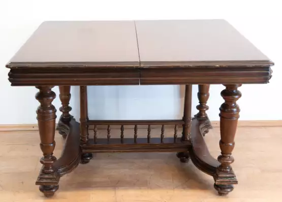 Lot 977 | Gründerzeit-Tisch und 4 Stühle, mahgonifarben, Kulissentisch auf 4 gedrechselten und verstrebten Beinen, 1 Einlegeplatte original und 3 ergänzt, starke Gebrauchspuren, an Zarge fehlen 3 Eckleisten, Furnierfehlstellen und…