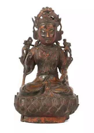 Lot 2388 | Guanyin China, ca. 15. Jh., Bronze, Reste einer alten Farbfassung, vol…