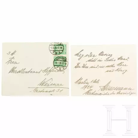 Die Karte (ca. 11,5 x 9 cm) mit handgeschriebenem Zitat "Sieg oder Unsieg ruht in Gottes Hand, der Ehre sind wir selber Herr und König", darunter "Berlin, 1 Juli 1924, Reichsminister des Auswärtigen" und eigenhändige Signatur. Dabei das an die Sammlerin adressierte Briefkuvert (geschlitzt und gelaufen).