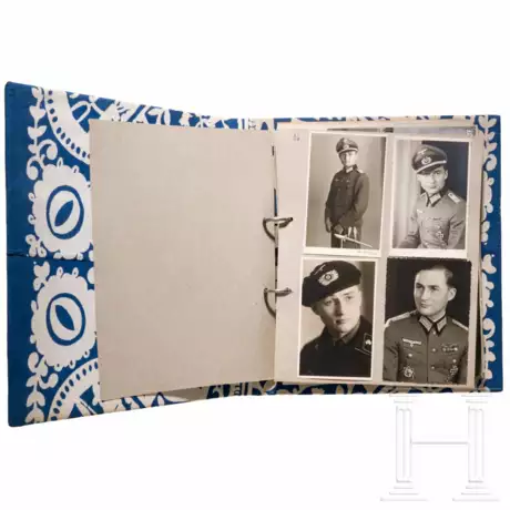 Unterschiedliche Formate, zumeist 5 x 7 und 7 x 10 cm, wohl später auf Karton montiert und in Ordner aufbewahrt. Dabei Portraitaufnahmen Hilds, vor und nach der DKiG-Verleihung oder in der frühen Panzersonderbekleidung mit Barrett, großformatige Aufnahme (Maße 20,5 x 28 cm) der Vereidigung 1937, Ausbildung, zahlreiche Aufnahmen von vierachsigen Spähwagen, teils auch verunglückt, vom Einmarsch in Österreich, Polenfeldzug, viele Aufnahmen der frühen Panzersonderbekleidung, Frankreichfeldzug, erbeutete und zerstörte Fahrzeuge, Vormarsch im Osten, Spähpanzer in Wintertarnung u.v.m. Zusammen mit Abzügen von Hochzeitsfotos Hilds und Nachkriegsmaterial zur Pz.Aufkl.Abt. 5 (wie Adressliste ehemaliger Angehöriger). Hochinteressantes Fotomaterial.