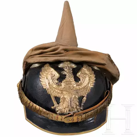 Korpus aus schwarz lackiertem Leder (krakeliert, Hitzespuren) mit Beschlägen aus gelbem und weißem Metall. Durch zwei Lederkeile fixierter gelber Dragoneradler. Weißes Kreuzblatt mit abschraubbarer glatter Spitze, Perlstabfries und vier goldenen Sternsplinten. Gewölbte, lederunterfütterte Schuppenketten an Steckrosetten mit beiden Offizierskokarden. Ockerfarbenes Seidenripsfutter (fleckig, Risse) und braunes Lederschweißband. Dazu der passende feldgraue Überzug für Offiziere (etwas fleckig, kleine Risse). Große Kopfgröße. Partiell leicht beschädigt, Altersspuren.
