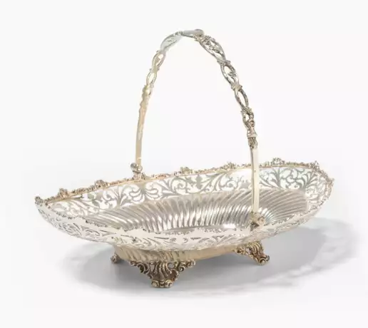 Silber, Meistermarke George Jackson & David Fullerton. Ovale Form mit Bogenhenkel auf Volutenfüssen, Wandung godroniert und ornamental durchbrochen. L 25 cm, ca. 370 g.