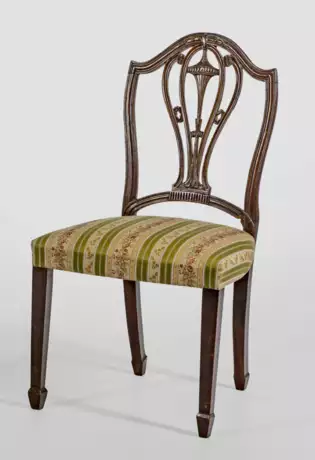 Mahagoni. Bombierte Zarge auf gekanteten Beinen. Durchbrochen gearbeitete, geschweift ansteigende Rückenlehne aus Volutenmotiven. Sitzfläche gepolstert und bezogen. Sitz-H. 47 cm.