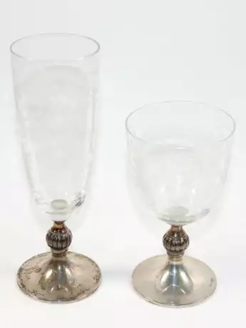 Schwäbisch Gmünd. Satz von 6 Champagnerkelchen u. 8 Süssweingläsern. Alle mit fein gravierter Kuppa. Füsse in massiv 925 Silber. Guter Zust.