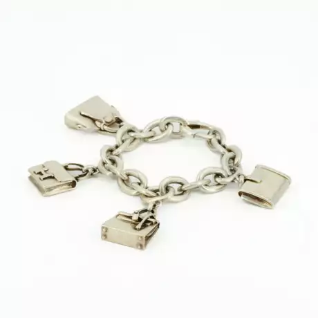 Description: Silver charm bracelet "La Ronde des Sacs" consisting of oval eyelets, featuring four