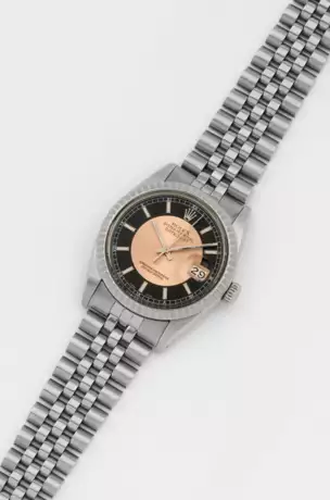 Stahl. Rundes Uhrengehäuse, geriffelte Lünette, schwarzes und satiniertes, roséfarbenes Zifferblatt mit römischen Indexen, bzw. Stabindexen mit Tritium-Auflage mit korrespondierenden Zeigern und Datumsanzeige. Saphirglas. Automatikwerk. Jubilee-Armband mit Faltschließe. Herstellerzeichen. D. 35 mm. Gew. ca. 88.92 g.