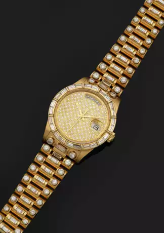 Gelbgold, gest. 750. Vollständig ausgefasst mit Diamanten von zus. ca. 10,08 ct. (F/if). Rundes Uhrengehäuse, Stabzeiger mit Tritium-Auflage, Wochentag- und Datumsanzeige. Saphirglas. Automatikwerk. Präsidentenarmband mit doppelter Faltschließe. Ref.-Nr. 18038. Serien-Nr. 9147845. D. 35 mm. Herstellerzeichen. Gew. ca. 151,22 g. Original Box mit Wertgutachten und Rolex-Garantie-Pass von Tiffany & Co. Ersatzzifferblatt.