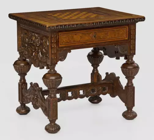Nussbaum, reliefplastisch geschnitzt und furniert. Gerader, einschübiger Zargenkasten, seitlich mit reichem Dekor aus reliefplastischen Voluten auf mehrfach gegliederten Balusterbeinen, unterhalb durch korrespondierende Stege verbunden. Gering überstehende Deckplatte mit eingelegter Spiefläche für Schach, begrenzt von Bandeinlagen. H. 79 cm. 80 cm x 65 cm.