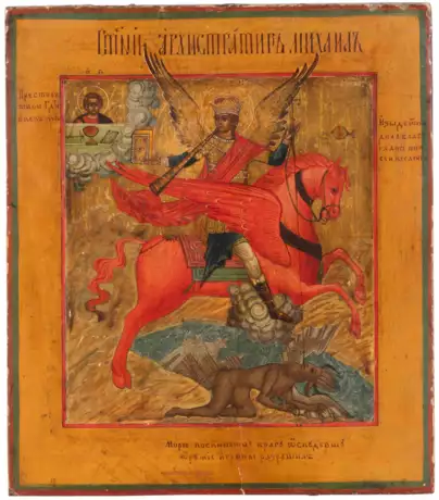 Russisch, um 1800. Tempera über Kreidegrund auf Holz. Im vertieften Bildfeld auf Goldgrund Darstellung des Erzengels mit Posaune, den Satanas zu seinen Füssen in die dunklen Fluten des Schwefelmeers stossend, in denen auch die Stadt Babylon versinkt. In der linken oberen Bildecke Christus Emmanuel hinter dem bereiteten Altar stehend. 30,5x26,5 cm.