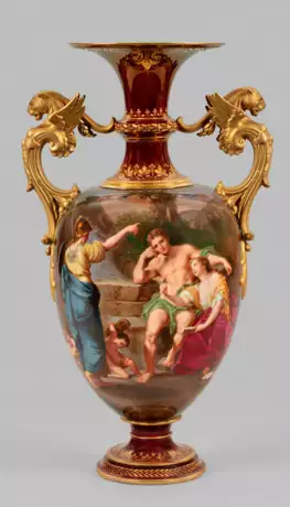 Sog. Renaissance-Henkelvase. Ovoider Korpus mit gerundeter Schulter, abgesetztem, eingezogenem Hals mit gedrücktem Nodus und ausschwingendem Rand. Beidseitig reliefplastische, vergoldete Handhaben aus Biskuitporzellan mit geflügeltem Pantherkopf, geschweift aufsteigend aus Palmettenansätzen. Flächendeckende mythologische Szene. Zentral sitzender, über seinen weiteren Lebensweg sinnierender Herkules. Zu seiner rechten stehende Athene in Rüstung mit Schild und Schwert, die Tugend verkörpernd. Zu seinen Füßen ihn bewerbende junge Dame mit Rosenblüte, das Laster versinnbildlichend. Am Boden kleine Amorettenknaben mit Keule und Löwenfell spielend. Im Hintergrund und auf der Rückseite eine weitläufige Waldlandschaft. Als Vorbild diente das Ölgemälde "Herkules am Scheidewege" von Pompeo Girolamo Batoni (1708-1787). Fuß und Hals mit purpurfarbenem Lüsterfond und reicher Reliefgoldornamentik. Form-Entw. Julius Wilhelm Mantel, 1860. Äußerst feine polychrome Malerei. Undeutl. Maler-Sign. Unw. rest.; Zepter- und Malereimarke. H. 45 cm.