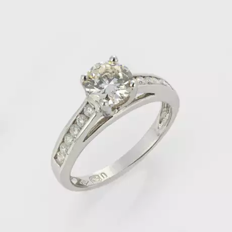 Ring set with a brilliant solitaire approx. 1,04 ct. (G/vsi) and brilliants approx. 0,50 ct., in 18 k white gold.