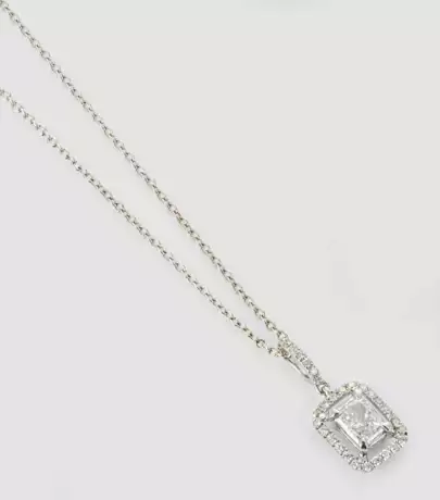 Weißgold, gest. 750. Zentral besetzt mit einem Diamanten von ca. 0,40 ct. (E/vvs) im Radiantschliff, entouriert von kleinen Brillanten von zus. ca. 0,20 ct., an feiner sog. Erbsenkette. Ges.-Gew. ca. 3,16 g.