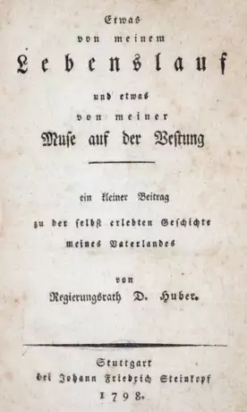 Erste Ausgabe der autobiographischen Schrift über die Zeit seiner Gefangenschaft auf dem Hohenasperg (1764), mit einer Sammlung dort verfasster Gedichte. - Stockfleckig, Titelbl. mit kl. Einriß.