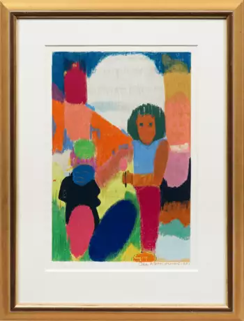 Farbserigraphie/Velin, 1966. Im Druck sign. und dat. (19)66. L. u. nummer. 119/270. Farbenfrohes Blatt der Adolf Hoelzel- und Bauhaus-Schülerin. Darstellung 46 cm x 30 cm. Rahmen.