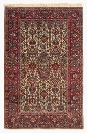 Z-Persien, um 1900. Dichtes florales Dekor. Auf beigem Grund zeigt sich ein dekoratives nachtblaues, langgezogenes Hexagon, flankiert von 4, sich spiegelnden, blumengefüllten Vasen mit Kerzenständern, kunstvollen Floralmotiven und Blattranken. 2 aparte Nebenbordüren säumen die grosszügig angelegte, rote, mit Ranken und alternierenden Palmetten elegant belegte Hauptbordüre, die einen stilvollen Rahmen bildet. Sehr gute Erhaltung 135x198 cm (ft. 4.5x6.5).