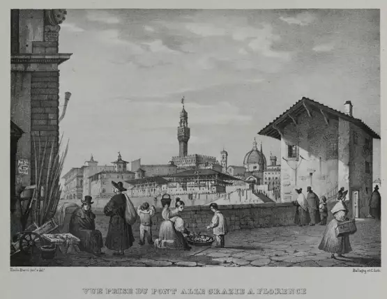 ╔Darunter:╗ Villa Minor Matheia intra Farnesianam prospecta v. J. Prou. - L'Eglise de Sr.Pierre à Rome. Guckkastenkupfer. - Vue du Pont Alle Grazie a Florence. Lithogr. n. Emilio Burci.